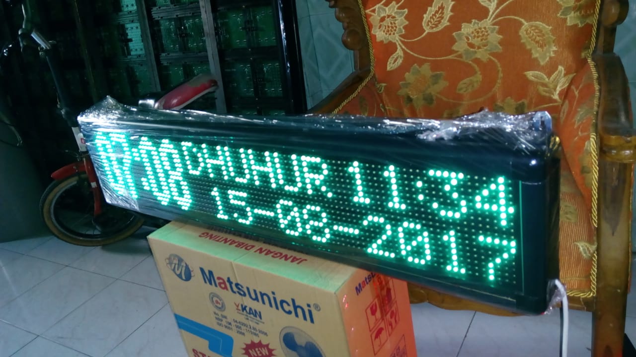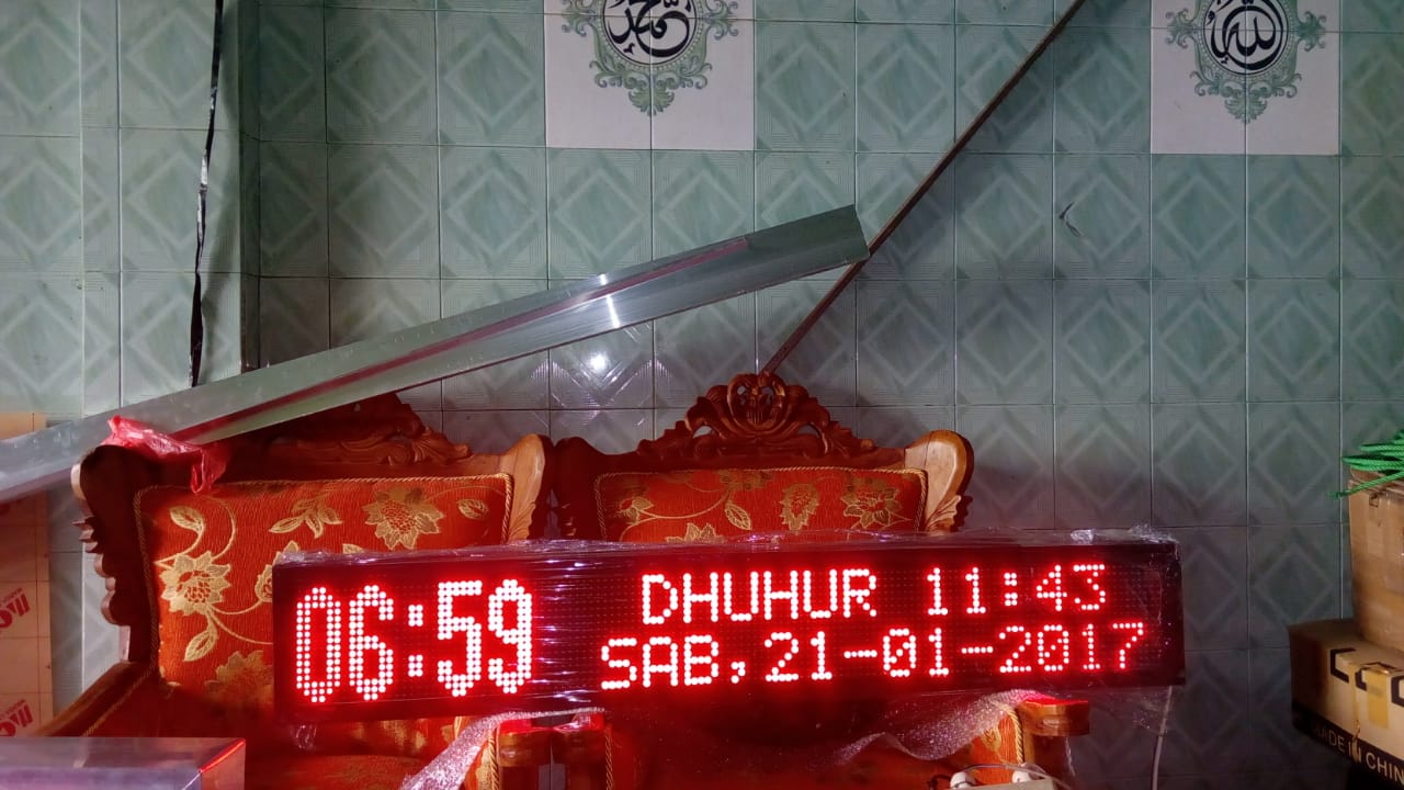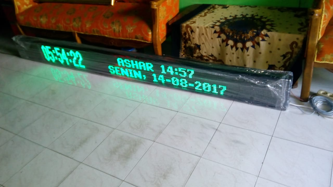 Untuk daerah Surabaya khususnya serta daerah Jawa Timur pada umumnya Masjid-masjid serta surau-surau hampir semuanya sudah menggunakan Jadwal sholat digital karena Jadwal sholat digital ini sangat di butuhkan keberadaanya. Selain bisa menepatkan waktu datangnya adzan, juga bisa menepatkan waktu datangnya sholat.inilah yang mendasari penggunaan jadwal sholat digital di masjid- masjid ataupun surau-surau atau langgar- langgar kecil di kota surabaya untuk memastikan datangnya adzan serta waktu sholat. Untuk Jadwal sholat yang di gunakan di masjid-masji atau surau-surau ini untuk ukuran standartnya adalah 20 cm x 130 cmdan terdiri dari 4 modul, sebelumnya perlu di ketahui bahwasanya untuk Led penyusun Running text atau jadwal sholat ini menggunakan element-element yang di sebut modul.Untuk penggunaan Running text atau Jadwal sholat ini biasanya menggunakan 4 modul penyusunya. untuk ketinggian bisa 20 cm atau 40 cm.untuk 20 cm itu ukuran standart ketinggian suatu modul.Apabila modul itu 40 cm itu untuk penggunaan tulisan yang bersususun. itu biasanya di gunakan apabila Running text atau Jadwal sholat itu ingin menggunakan penyusun kalimat yang lebih banyak untuk keperluan suatu pengumuman di masjid atau langgar tersebut.